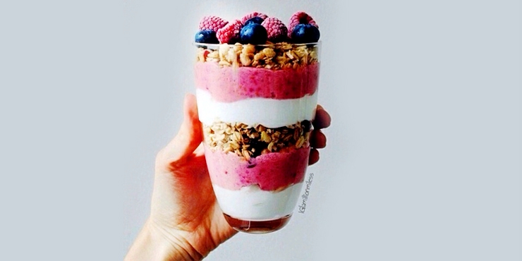 13. Un vaso lleno de Yogurt, granola y un poco de smoothie de arandanos con zarzamoras. ¡El desayuno ideal!